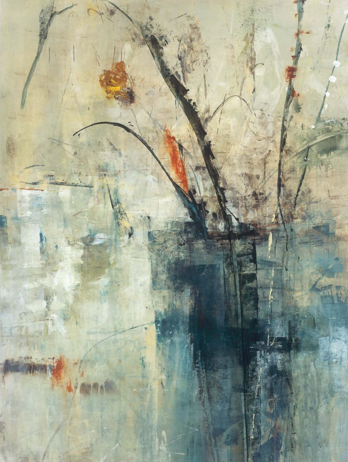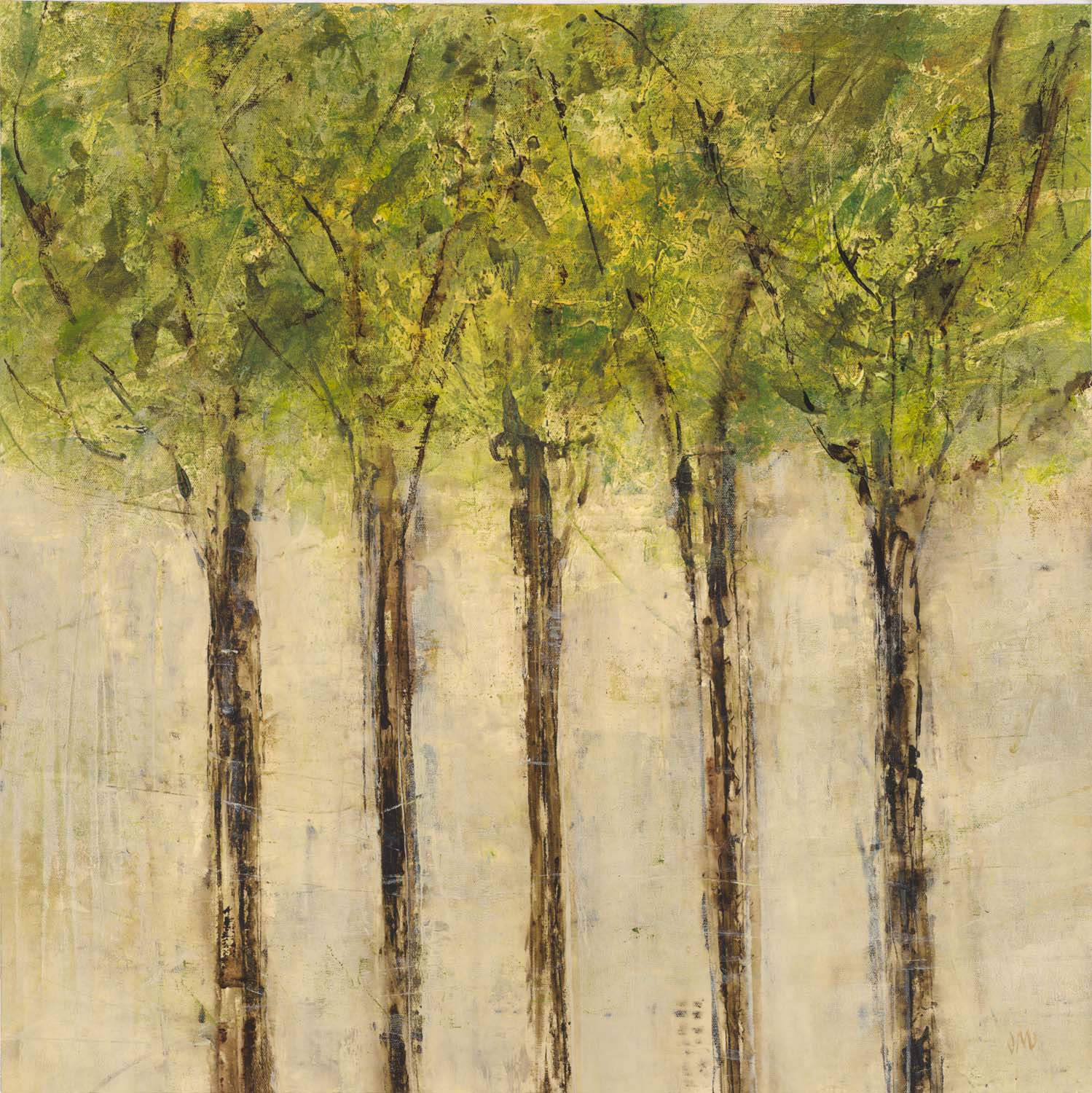 Jodi describes her work as a spontaneous blend of harsh and soft applications of paint – applied fast and furiously – coupled with slow and deliberate layers to create a contemporary urban feel. The subtle layers and rich depths are an invitation into an ethereal mystique, revealing unexpected details that delight and entertain. She prefers to work with acrylic paints, because of their transparent layering qualities and depth, along with the added bonus of drying quickly. Says the artist, “My paintings take on their own life as I paint them. I don’t plan it out first, I work very spontaneously.”